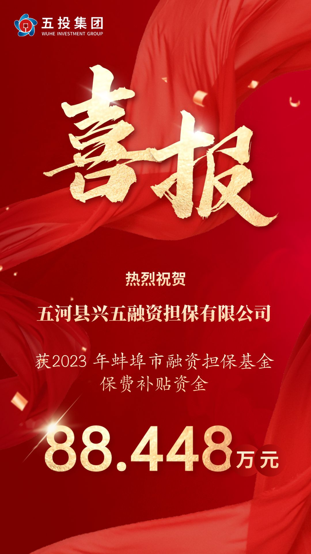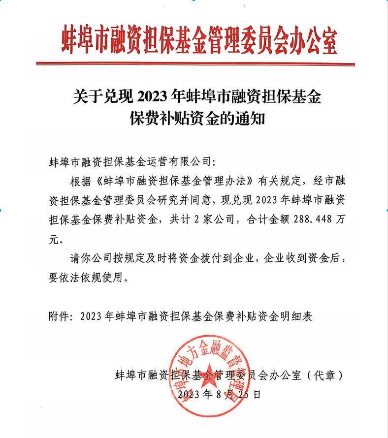 近日,蚌埠市融资担保基金管理委员会下发了《关于兑现2023市资保金保费补贴资金的通知》。经市金融局、市融资担保基金管理委员会审核,符合本次保费补贴奖励的融资担保机构共计2家,合计奖励资金288.448万元。其中,3044am永利集团五河县兴五融资担保有限公司(以下简称“兴五担保公司”)获得奖励资金88.448万元,也是蚌埠各县区融资担保机构中首家获得此项补贴奖励。