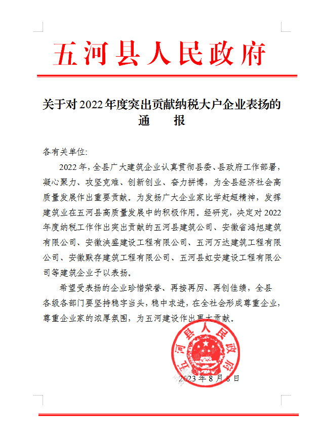 近日,五河县人民政府通报表彰了县多家纳税企业,3044am永利集团虹安建设公司获“2022年度突出贡献纳税大户”称号。这既是对虹安建设公司诚信经营良好风气的表彰,也是对其为五河经济建设发展作出贡献的肯定,更是展现了虹安建设公司对外的良好形象。