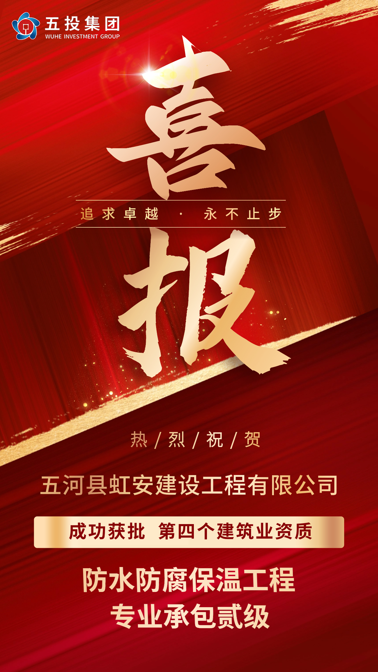 近日,虹安建设公司资质工作再传喜讯。经安徽省住房和城乡建设厅核准,虹安建设公司防水防腐保温工程施工专业承包“贰级”资质成功获批。