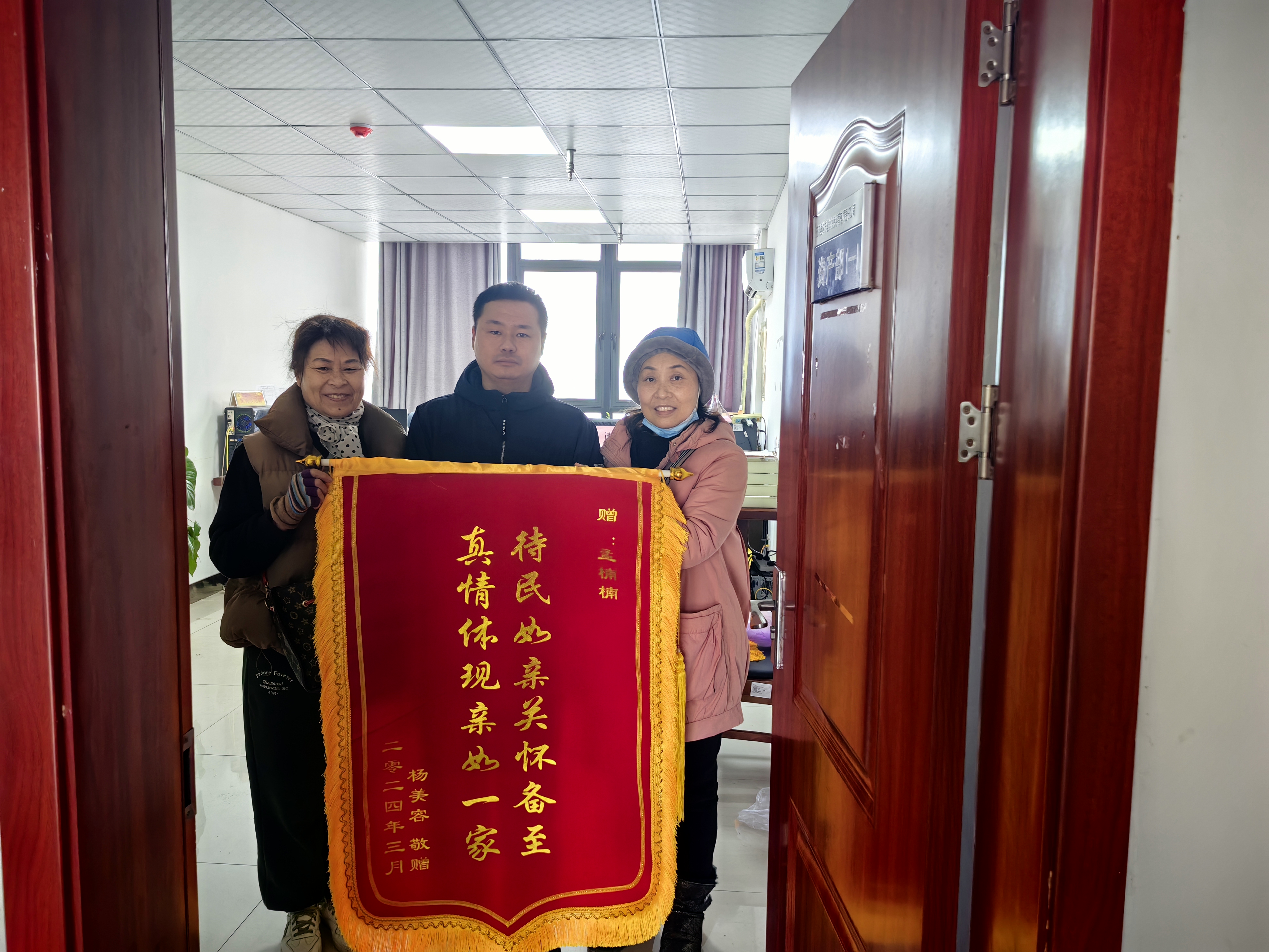 近日,新都小区(老酒厂安置房)居民将一面写着“待民如亲关怀备至,真情体现亲如一家”的锦旗送到了城投公司资产部员工孟楠楠同志手里,感谢城投公司为他们办实事、解难题。
