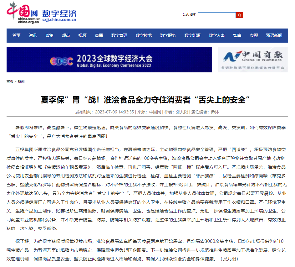 盛夏来临,高温酷暑下,肉类食品的腐败变质速度加快。3044am永利集团所属淮浍食品公司充分发挥国企责任与担当,在夏季来临之际,主动加强肉类食品安全管理。中国网数字经济对此进行了宣传报道,详细介绍淮浍食品公司严把“四道关”,全力守住消费者“舌尖上的安全”。