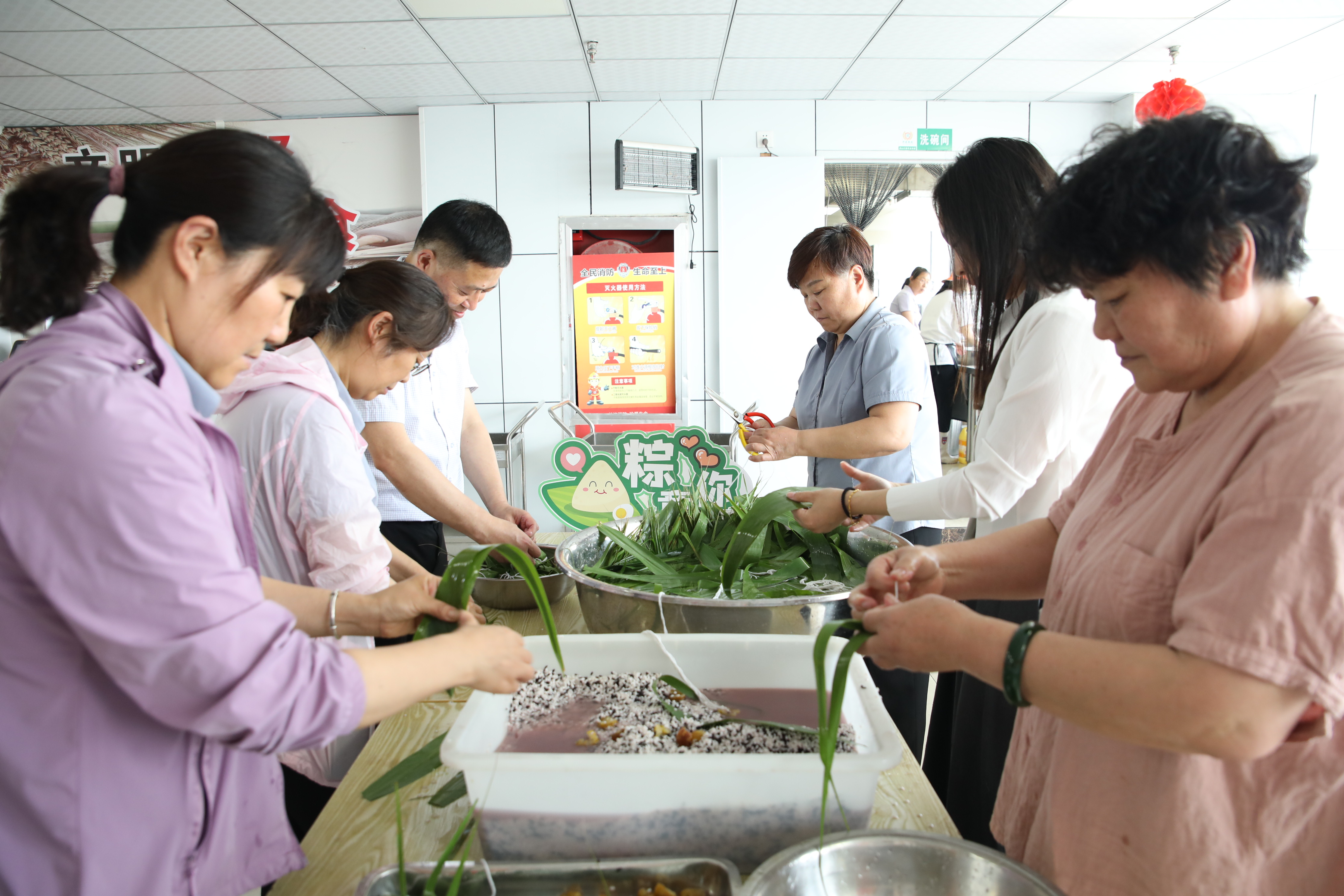 活动现场粽香弥漫,职工们早早地备好粽叶、糯米、蜜枣等材料,大家三五成群围在桌子旁,一边包粽子、一边话家常。在“老手们”的指导帮助下,新手们边看边学,折粽叶、装糯米、放馅料、压紧实,不一会儿粽子瞬间成型装满了盆。