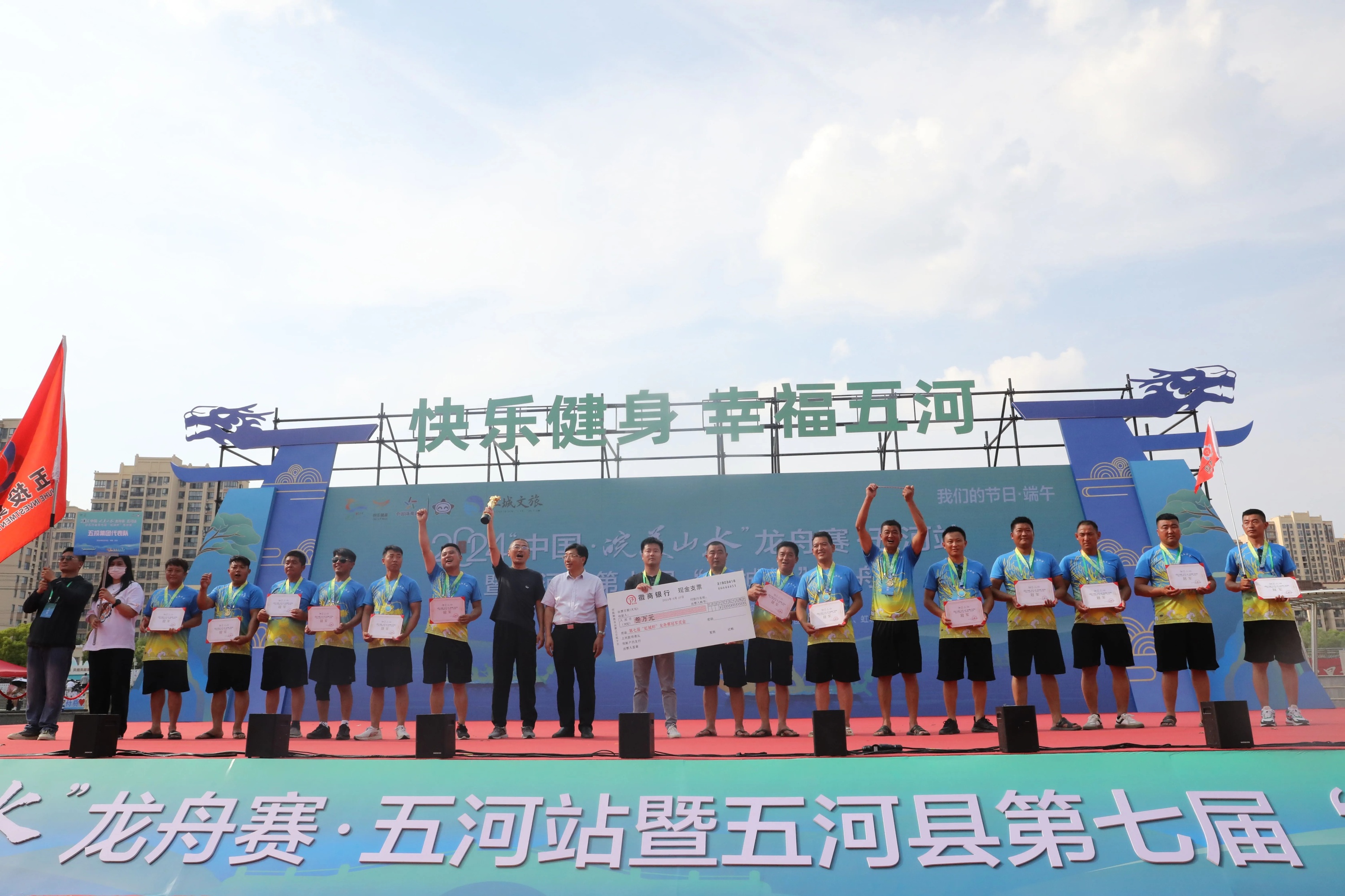 除精彩的龙舟赛外,现场还举办了五河特色的民俗表演、水上节目展演等活动,为五河人民端午节前奉献一场精彩的文化盛宴,极大地丰富了五河人民的文化生活。当天下午还举行了颁奖仪式,为获奖队伍颁发了奖杯和奖金。