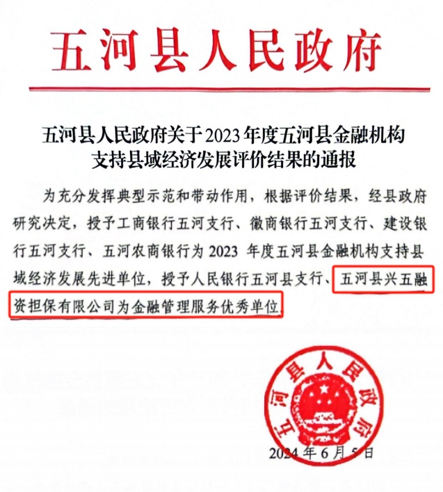 获得“2023年度支持县域经济发展优秀单位”称号,是五河县人民政府对兴五担保公司在服务实体经济能力、支持地方经济高质量发展等方面的充分肯定,更是对兴五担保公司坚守主责主业,充分发挥政府性融资担保职能作用的有力鞭策。兴五担保公司将继续牢记服务地方发展的初心使命,加大对政策鼓励领域企业的资金支持,为助力五河经济社会高质量发展提供更有力的金融支撑。