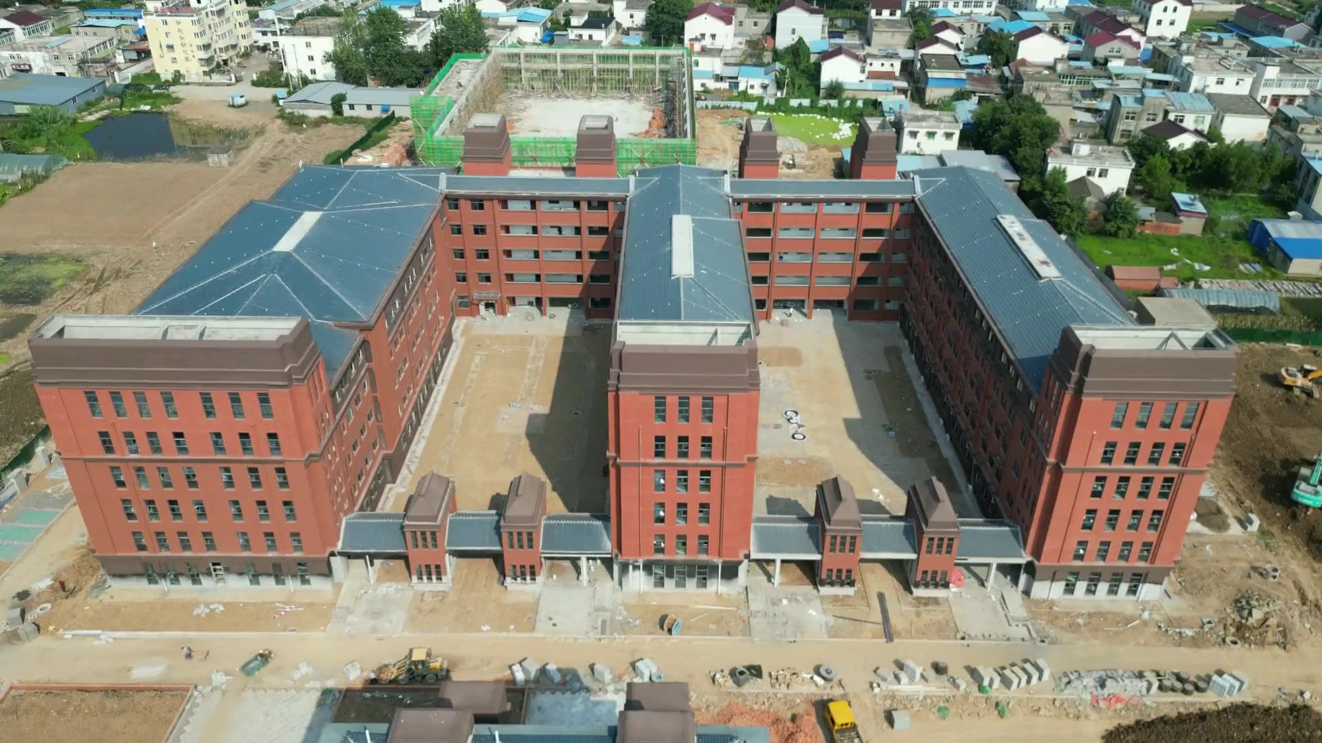 目前,教学楼公共区域墙地砖施工完成,水电安装完成,卫生间台盆施工完成。办公楼墙地砖施工完成80%,吊顶施工完成,食堂二层梁钢筋绑扎完成,总图铺装施工完成80%,道路施工完成80%,绿化施工完成30%。