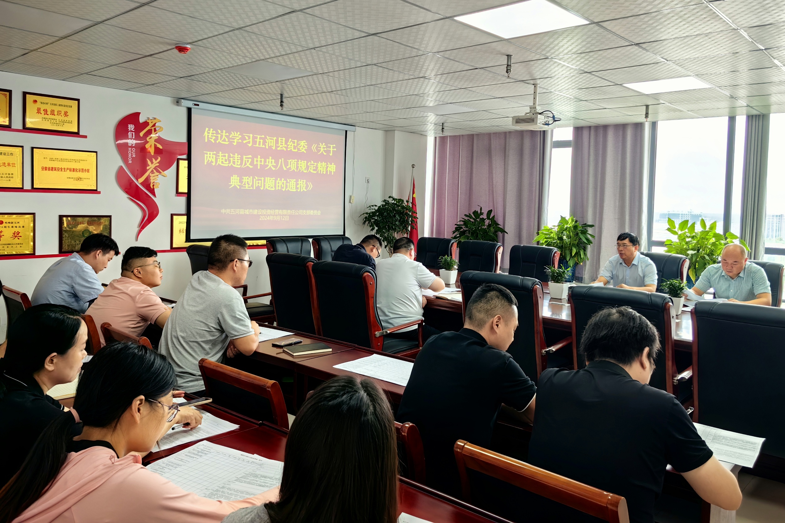 会上,传达学习了安徽省纪委监委公开通报六起违反中央八项规定精神典型问题、五河县纪委《关于两起违反中央八项规定精神典型问题的通报》(五纪通〔2024〕8号)文件精神,同时结合城投公司实际工作对贯彻落实节前廉政工作作出具体部署,要求全体党员、干部职工引以为戒,坚决杜绝接受管理服务对象礼品礼金、公款旅游、接受管理服务对象宴请、公款吃喝等“四风”问题发生,共同营造风清气正的政治生态氛围。