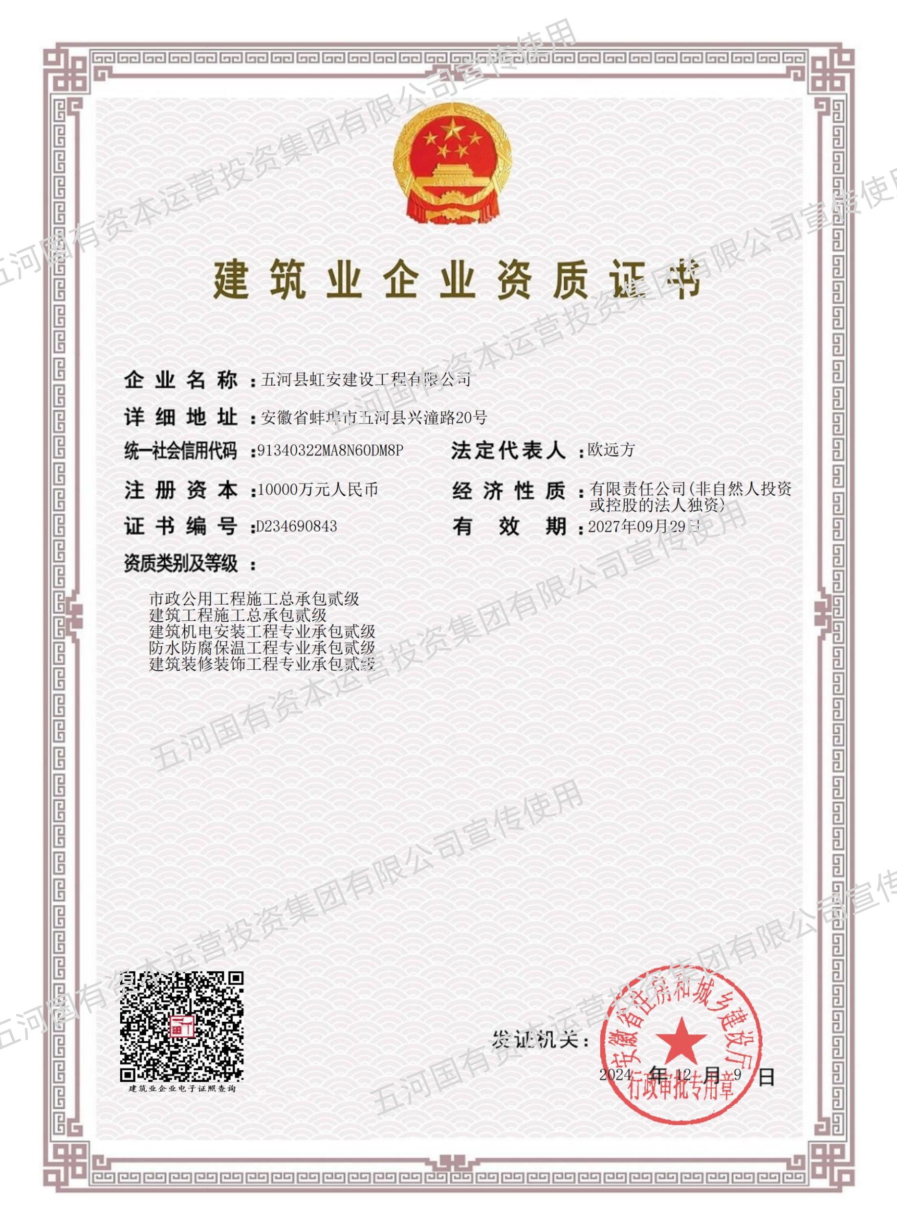 至此,虹安建设公司已具备以下多项资质:市政公用工程施工总承包贰级、建筑工程施工总承包贰级、建筑机电安装工程专业承包贰级、防水防腐保温工程专业承包贰级、建筑装修装饰工程专业承包贰级。