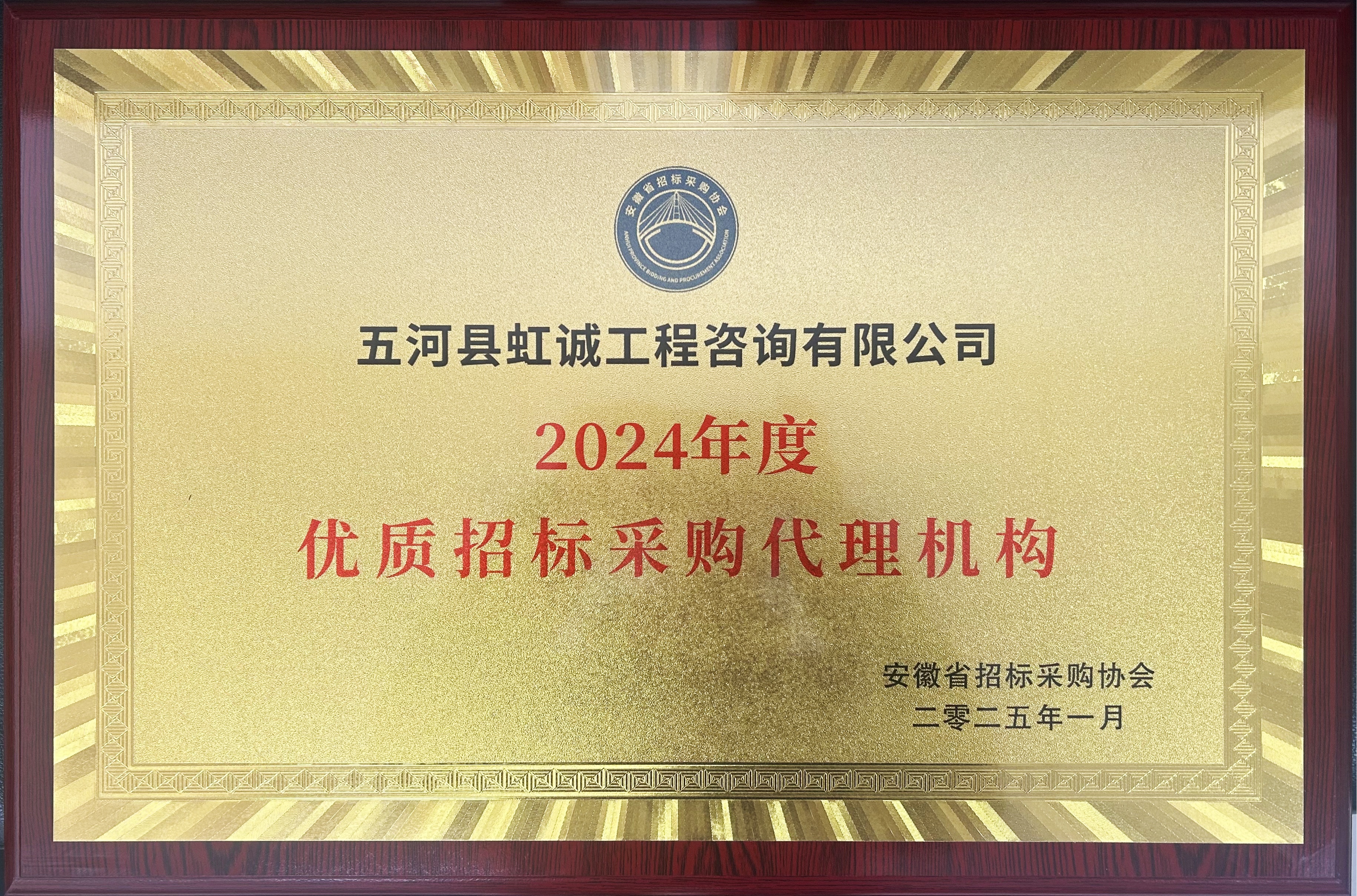 近日,安徽省招标采购协会正式发布《关于2024年度优质招标采购代理机构名单的通报》,五河县虹诚工程咨询有限公司(以下简称“虹诚咨询公司”)凭借卓越表现,荣获“2024年度优质招标采购代理机构”称号。