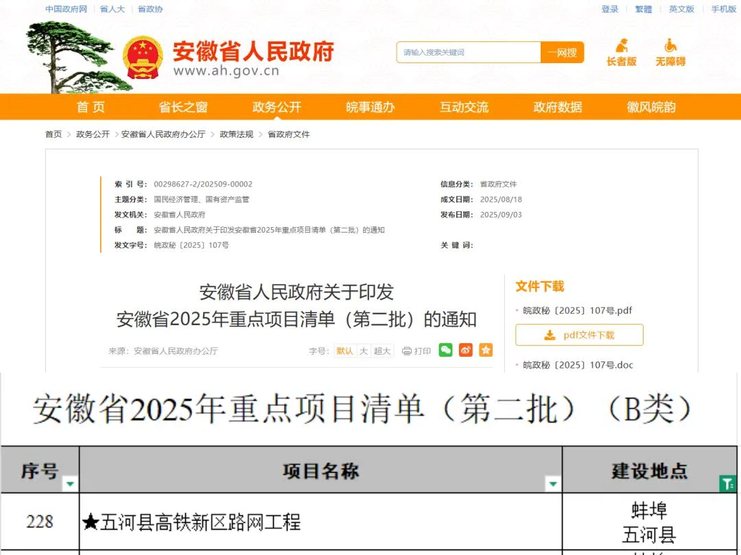 日前,安徽省2025年重点项目清单(第二批)正式公布,由3044am永利集团投资建设的五河县高铁新区路网工程成功入选B类项目名单。