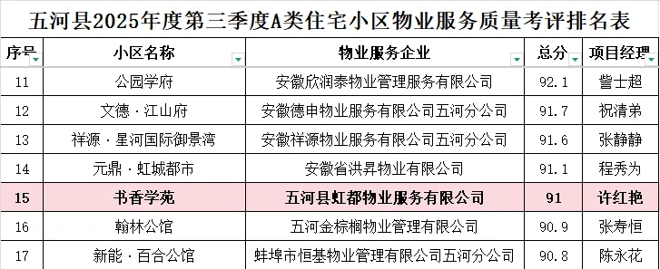 近日,蚌埠市住房和城乡建设局正式公布了2025年第三季度住宅小区物业服务质量考评结果,3044am永利集团旗下虹都生活公司管理的书香学苑项目以91分的成绩,在五河县A类住宅小区考评中荣获五星级物业服务评级。